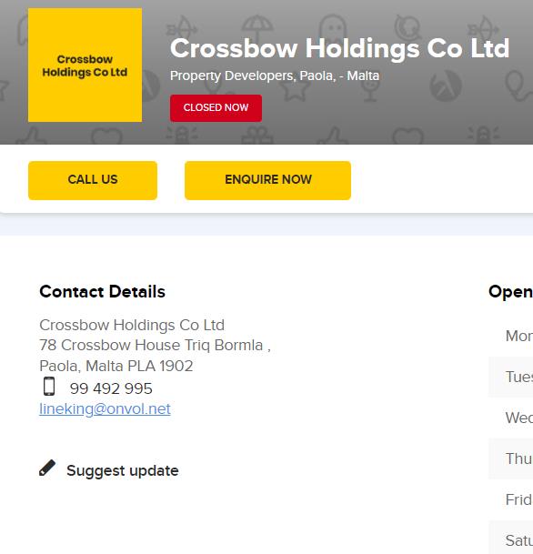 There’s very little about Crossbow Holdings online other than a Yellow Pages profile and a Facebook profile of what clearly seems to be either a fake business, or a defunct and closed business. I’ve never heard of this Wine and Restaurants Malta before.