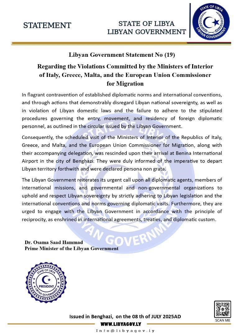 Following its visit to Libya’s capital Tripoli to discuss migration, the EU delegation flew to Benghazi but was told to turn away upon arrival at Benina International Airport. The EU delegation was composed of EU Commissioner for Internal Affairs and Migration Magnus Brunner, Maltese Home Affairs Minister Byron Camilleri, Italian Interior Minister Matteo Piantedosi and Greek Migration and Asylum Minister Thanos Plevris.