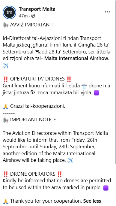 Transport Malta has issued a notice stating that no drone-flying is allowed during the Malta International Air Show during the weekend. The prohibition applies to most of the territory in Malta.