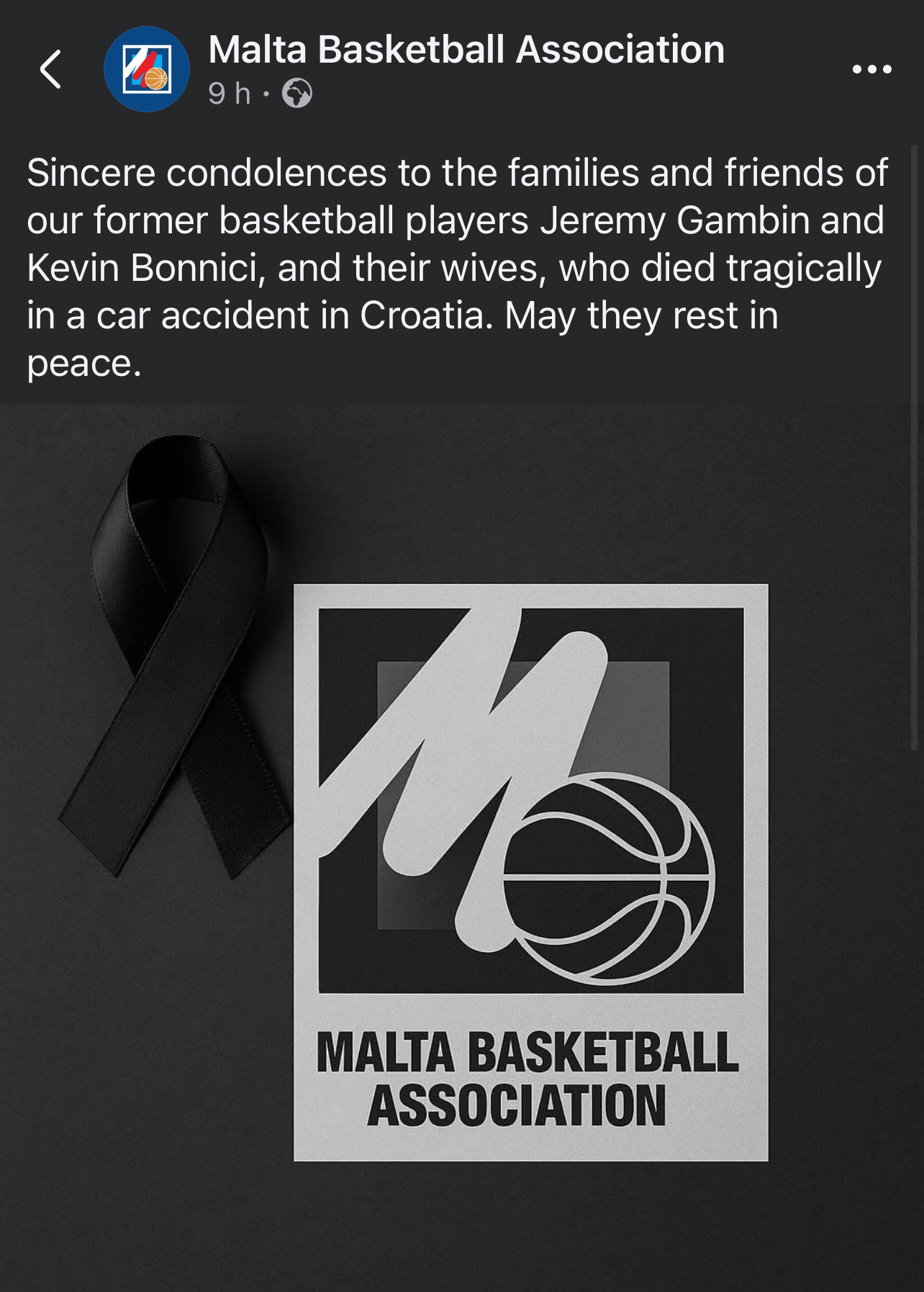 The Malta Basketball Association also extended its condolences โto the families and friends of our former basketball players Jeremy Gambin and Kevin Bonnici, and their wives, who died tragically in a car accident in Croatia. May they rest in peace.โ
