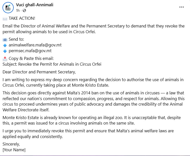 The media organisation Vuċi għall-Annimali is urging the public to petition the Director of Animal Welfare to apply the law and ban the circus.