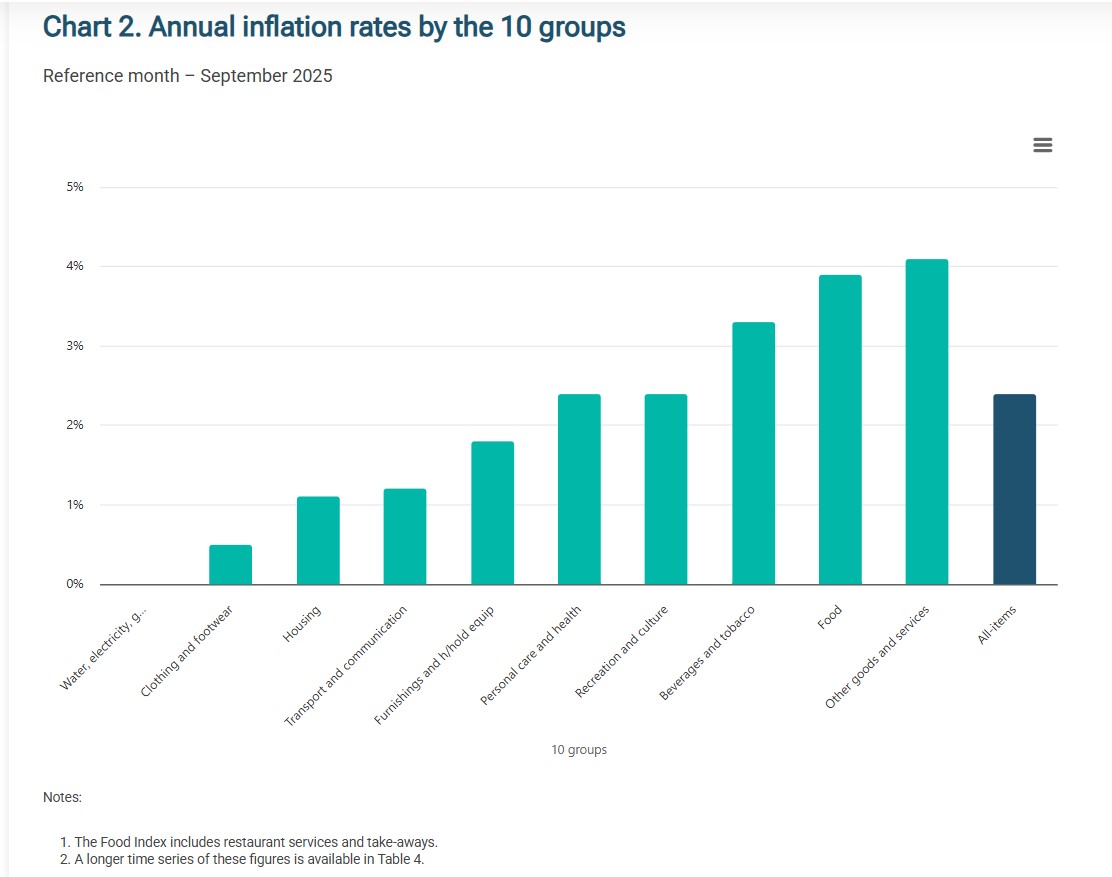 According to the latest statistics by the NSO, the retail price index has confirmed last week’s reading of the consumer price index showing that inflation in Malta has slowed down in September but food prices kept going up. Inflation dropped from 2.7% in August to 2.4% in September with food coming in the second place with a 3.9% annual increase and other items at 4.1%.