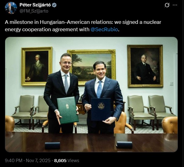 Hungary has also signed an agreement on nuclear energy cooperation with the agreement signed between the Hungarian Foreign Minister Péter Szijjártó and US State Secretary Marco Rubio.