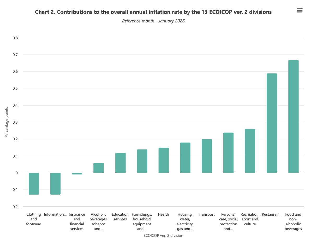 Downward contributions were recorded in clothing and footwear (-0.13 percentage points), information and communication (-0.13 percentage points) and insurance and financial services (-0.01 percentage points), largely due to lower prices for garments, mobile services and financial services.