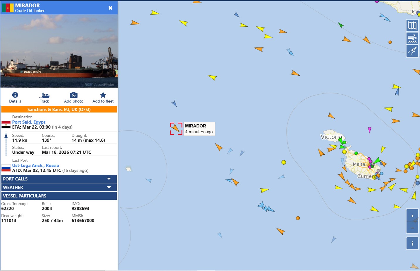 The Russian shadow fleet tanker, Fair Breeze (IMO: 9419723) has logged that it is travelling to Malta, Hurd’s Bank. On the other side of Malta, and outside its waters, another Russian shadow fleet tanker, the Mirador, is seen travelling to Egypt. Both tankers are sanctioned under the EU.