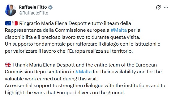 Yesterday, EU Executive Vice-President for Cohesion and Reforms Raffaele Fitto visited Malta and met with the Prmie Minister and Deputy Prime Minister at the Auberge de Castille. He also visited the EU Commission Representation in Malta and thanked its employees including head of the Commission’s unit in Malta, Maria Elena Despott.